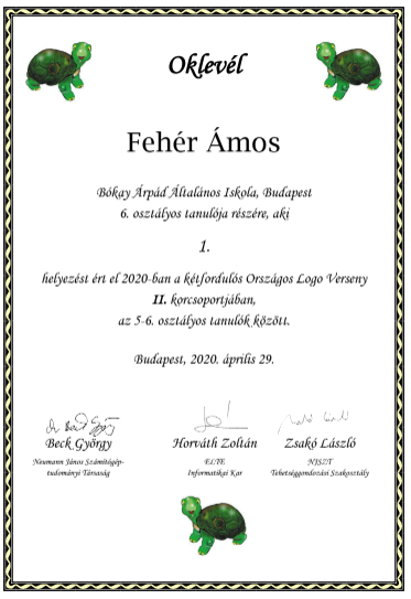 A tavalyi tanévben a Logo országos programozói verseny a járvány miatt a második fordulóban véget ért. Fehér Ámos fantasztikus eredményt ért el!